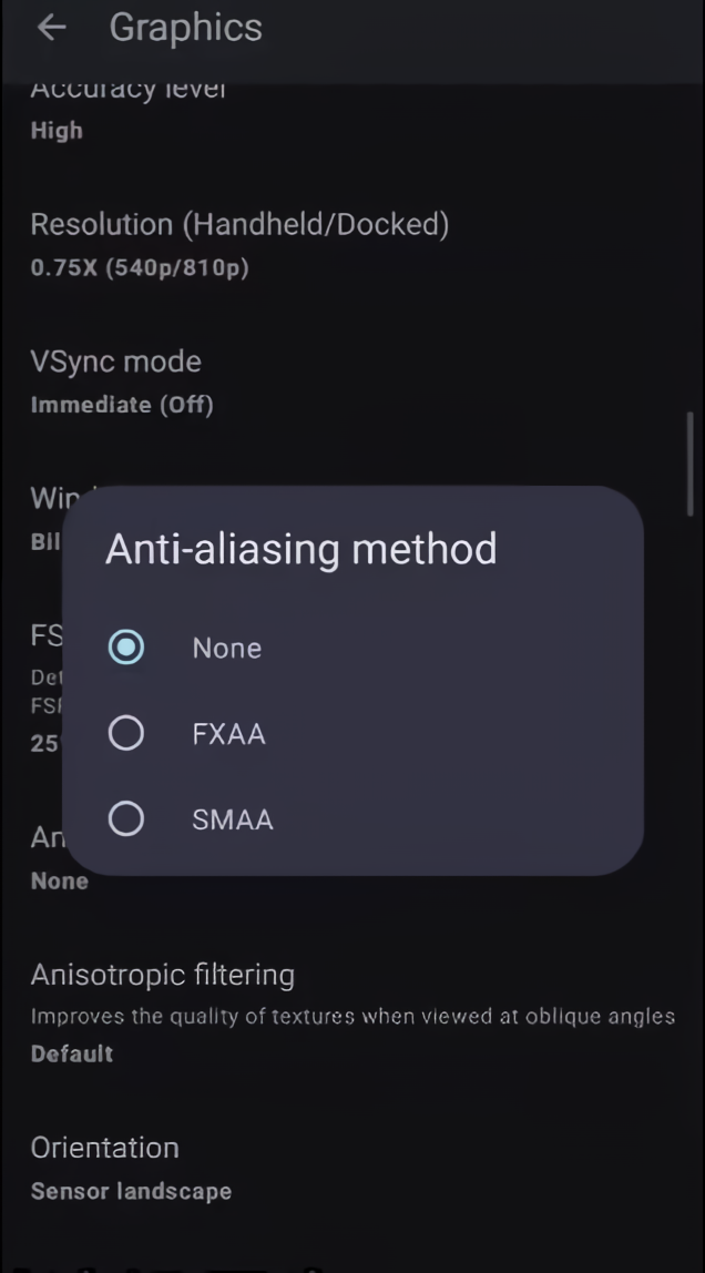 4、抗锯齿设置需调为 “None”(无),各向异性过滤则设为 “default”(默认)或 “auto”(自动)模式。