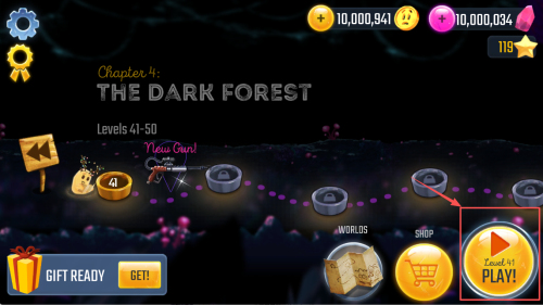 2、在章节列表中定位 “Chapter4: THE DARK FOREST”,点击 “Level 41” 后,再按 “PLAY!” 进入关卡。
