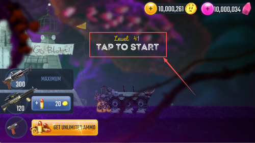 3、看到 “TAP TO START” 提示时轻点屏幕,接着点击 “GET UNLIMITED AMMO” 领取无限弹药,随后开始战斗。