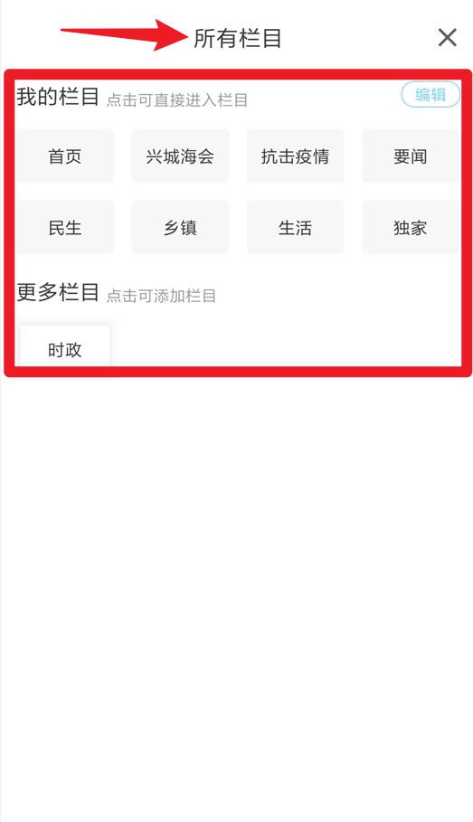 3、点击右上角的栏目按钮,可查看所有栏目,用户可以自定义添加或管理新闻分类,如乡镇、生活等。