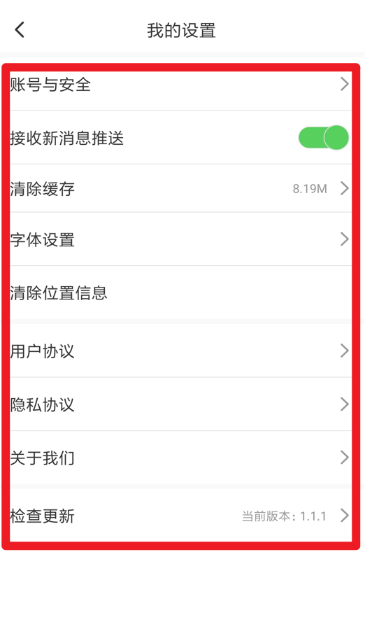 4、进入我的设置,可管理账号与安全、消息推送、缓存清理、字体大小等功能。