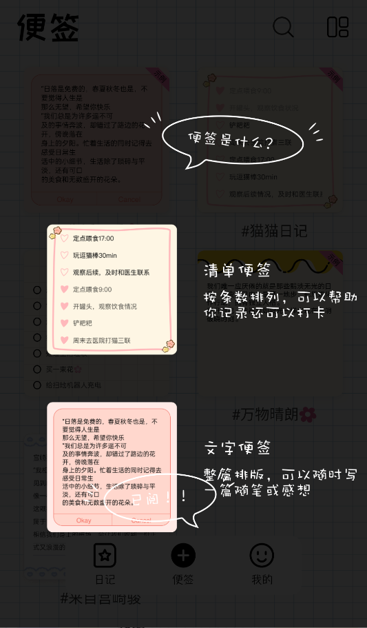 4、个性贴纸装饰:提供适用于多种场景的创意贴纸,使用这些贴纸为记录内容添加个性化的装饰与点缀。