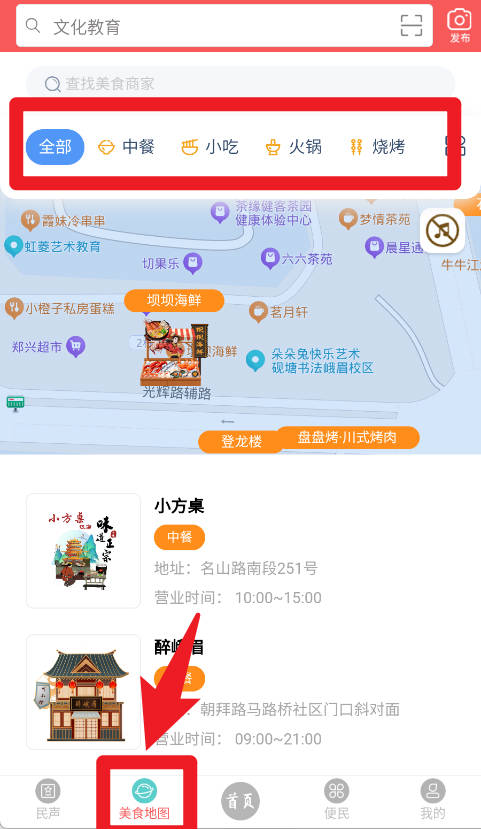 3、美食地图提供丰富餐饮分类,中餐、小吃、火锅、烧烤应有尽有。
