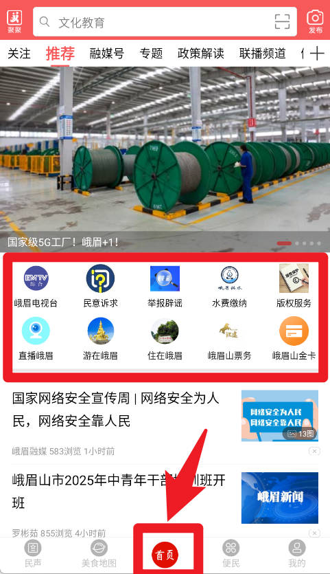 4、首页提供丰富功能入口,包括峨眉电视台、民意诉求、水费缴纳、版权服务等。