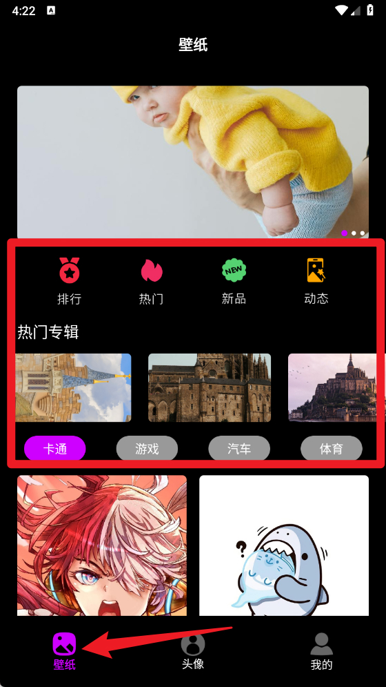 1、首次打开应用时,进入壁纸页面,可选择排行榜、热门、新品、动态等不同分类浏览壁纸。