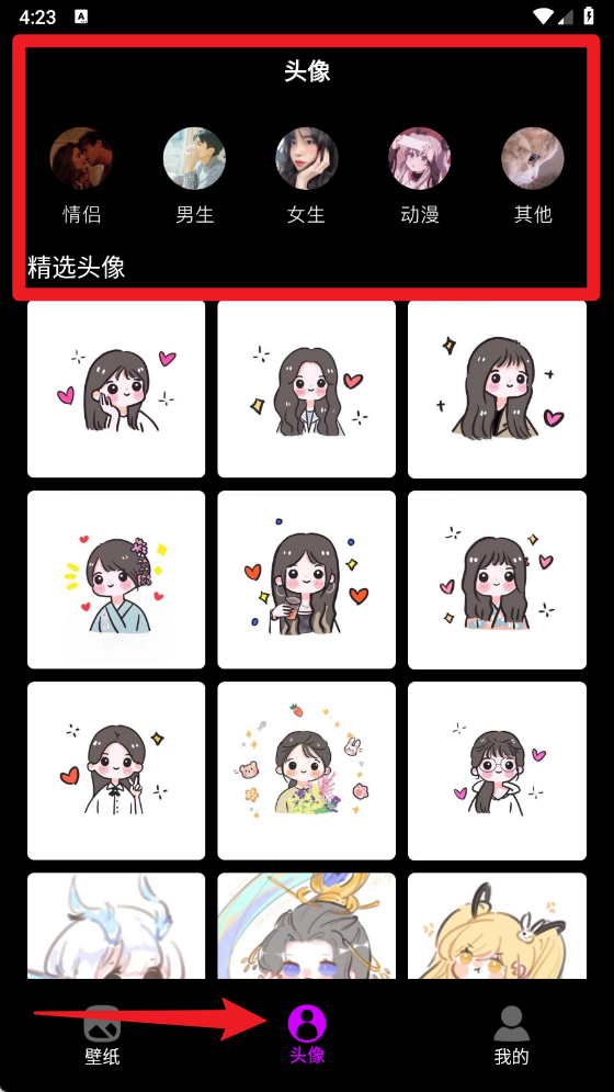 4、切换到头像板块,可选择情侣、男生、女生、动漫等精选头像,满足个性化社交需求。