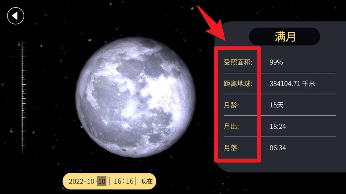 2、月相功能可实时查看当前月龄、受照面积及月出月落时间,便于天文爱好者观测记录。
