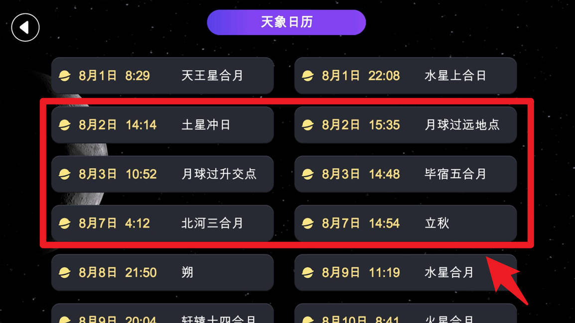4、天象日历提供全年天文现象时间表,包括行星冲日、合月等,帮助提前规划观测活动。