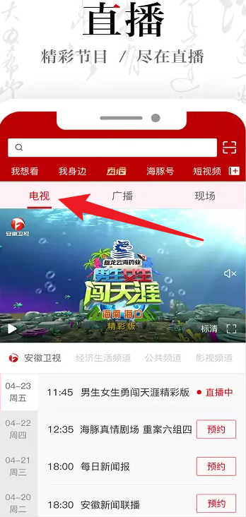 4、切换至电视页面,可观看安徽卫视及多个电视频道的实时节目,同时还能查看预告内容,方便提前安排收看。