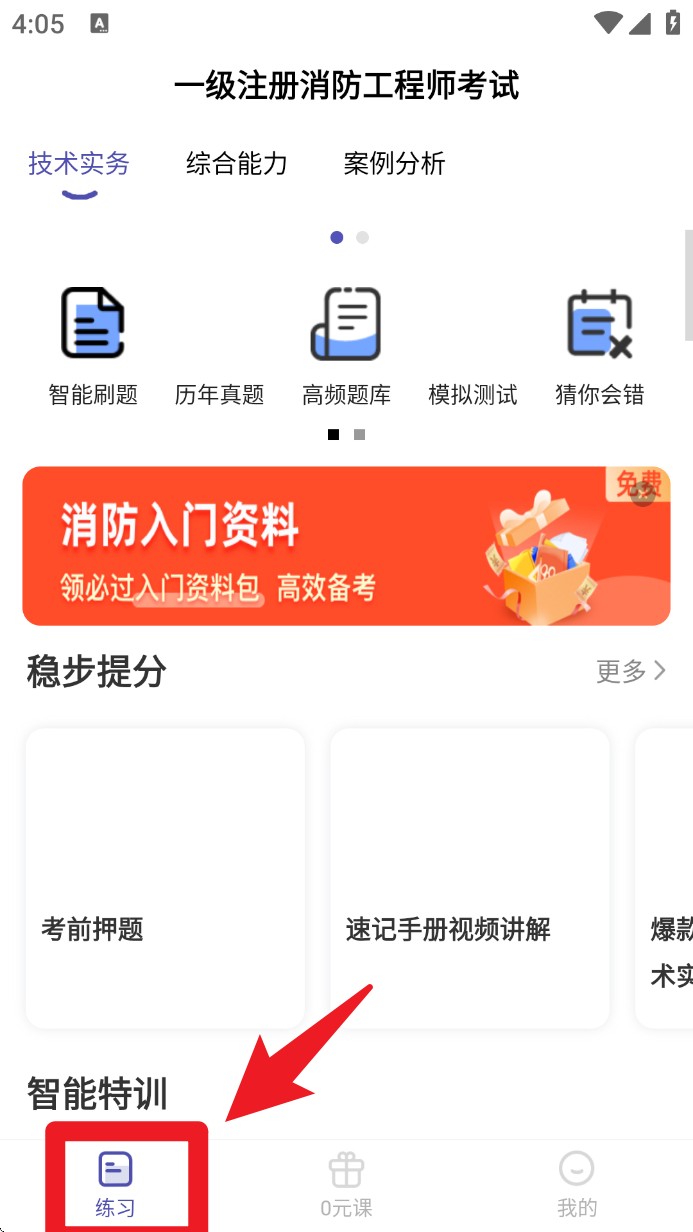 1. 在首页选择技术实务模块,点选下方练习图标可快速进入题库练习,搭配押题与视频功能使用。