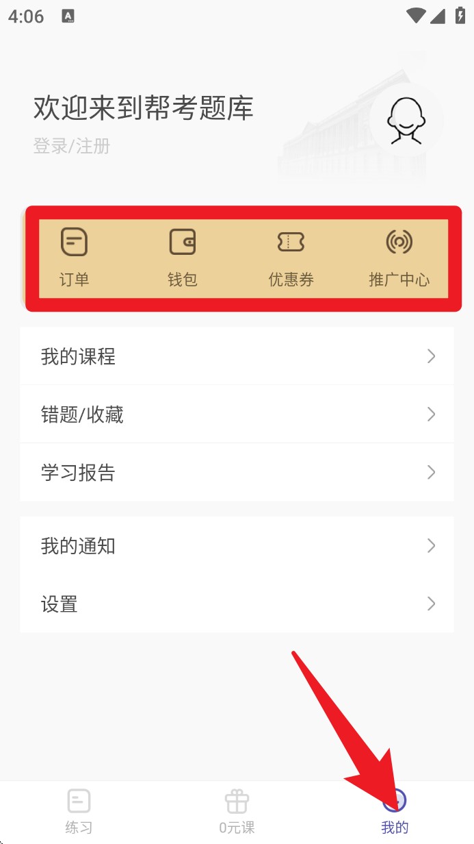 5. 切换到我的页面后可查看订单、钱包与优惠券,也能进入学习报告与错题收藏查看进度。