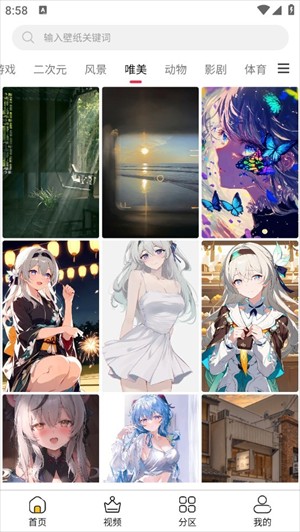 2、进入 “视频” 板块,动态壁纸按类别详细划分,风景、二次元、动漫等类型均可找到。