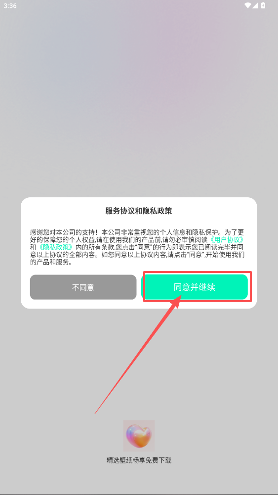 1、本站下载唐彩壁纸app,点击安装,安装完成点击进入软件2、跳出页面点击“同意并继续”