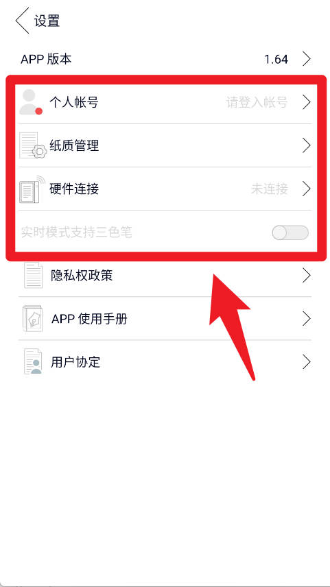 5、设置中心可进行账号管理、纸质连接及硬件对接,支持实时模式,提升书写体验。