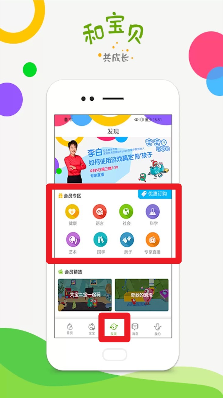 3. 切换到发现页签,进入会员专区,选择健康、语言、艺术等多个育儿专题内容。