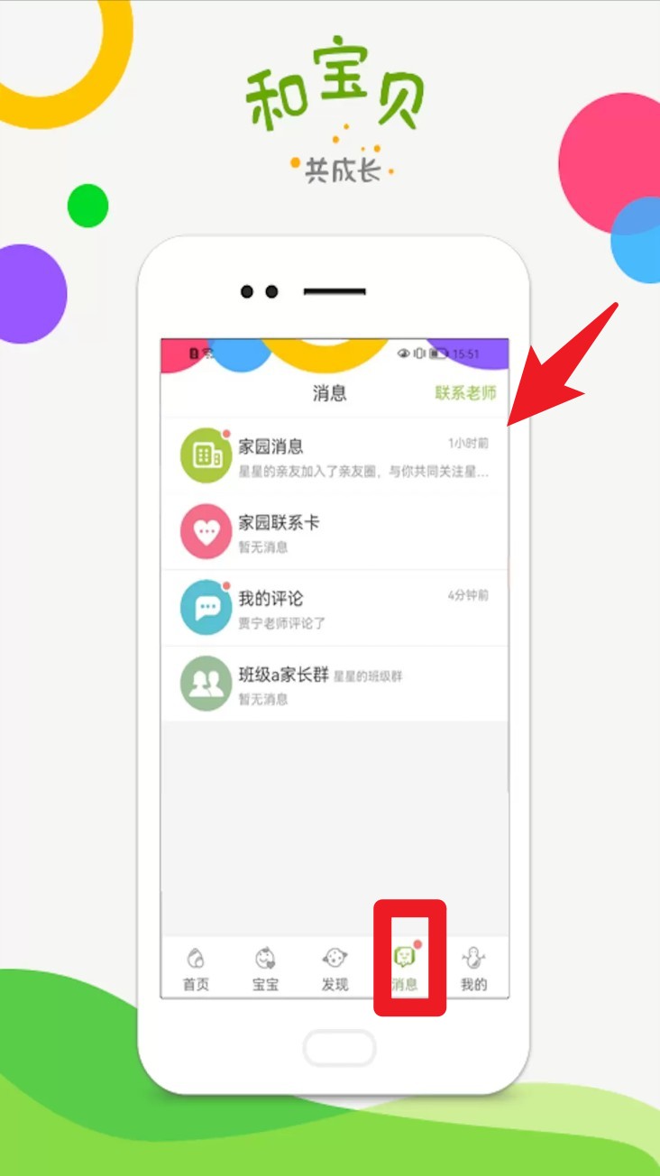 4. 在消息页签中可接收园所通知、老师评论,点击右上角按钮还可直接联系教师。