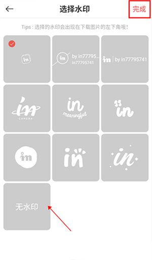 4、IN2024 最新版本默认自带水印,在此处可挑选任意喜欢的水印样式;若想去除水印,选择 “无水印” 即可。
