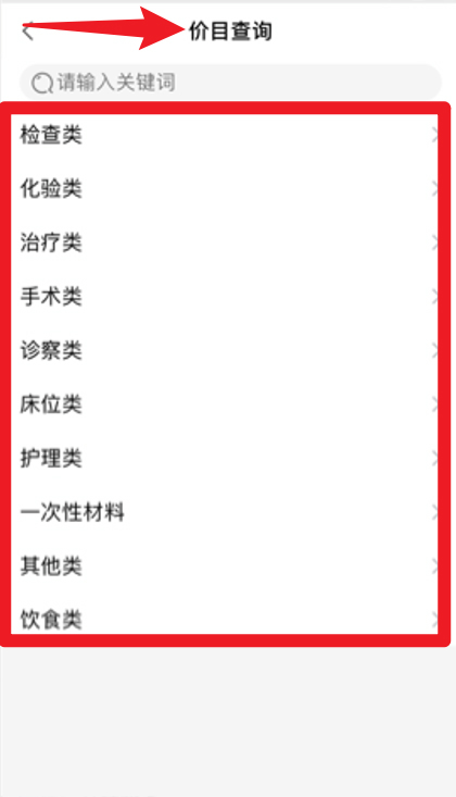 5、在价目查询页面可查找各类医疗项目价格,包括检查、手术、护理、床位等详细分类。