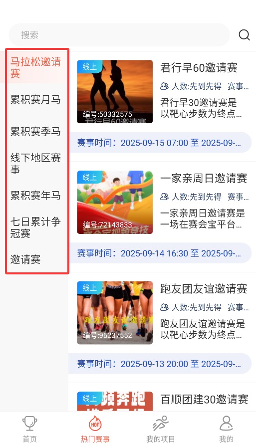 3、通过热门赛事专区,可查看马拉松邀请赛、累计赛、地区赛事及争冠赛等详情。