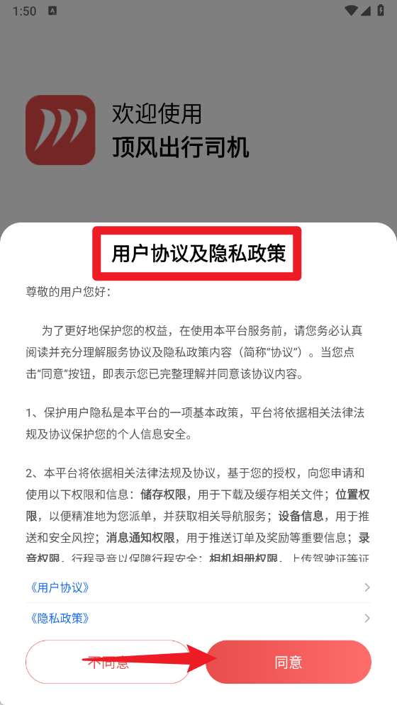 1、首次进入应用时需阅读《用户协议及隐私政策》,点击同意按钮后才能继续使用司机端服务。