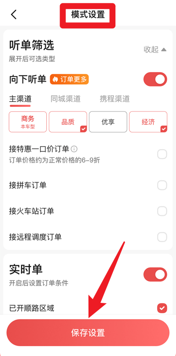 4、在模式设置中,司机可自定义订单类型,如商务、品质、经济等,并保存设置以便接单。