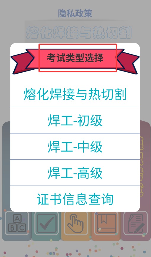 2、需先选择考试类型,如熔化焊接与热切割、焊工等级或证书查询等方向。