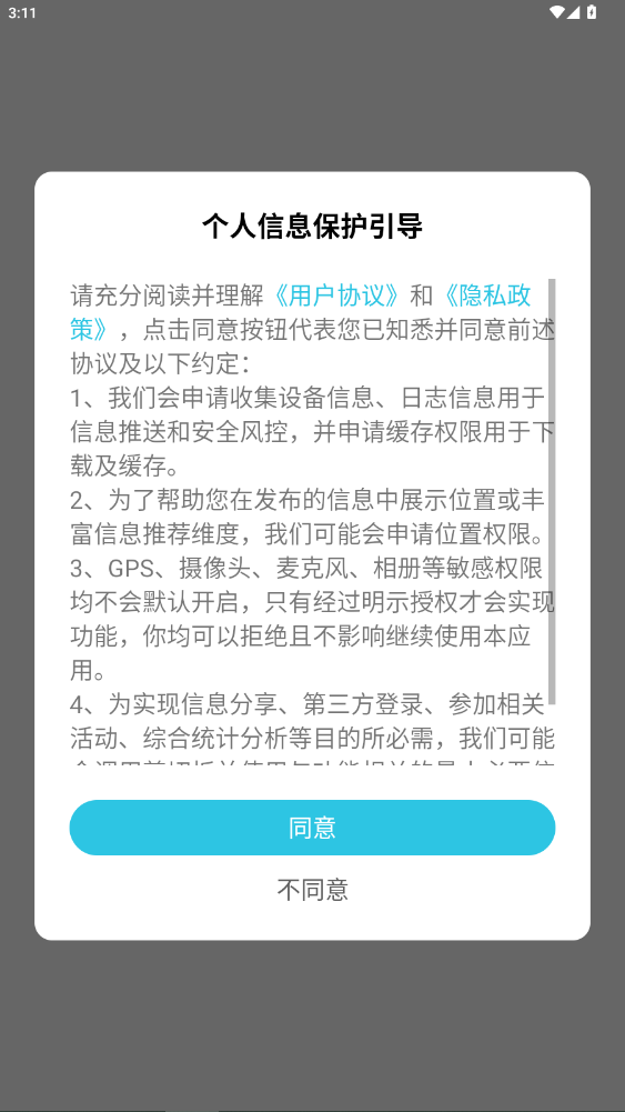 首次使用时,会弹出个人信息保护引导窗口,仔细阅读《用户协议》和《隐私政策》后,点击 “同意” 即可继续使用。