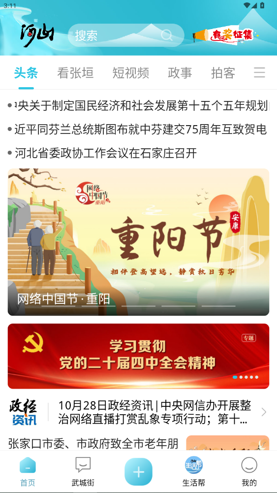 进入 “首页”,顶部有搜索栏可搜索感兴趣的内容,还有 “头条”“看张垣”“短视频”“政事”“拍客” 等分类标签。在这里可以浏览各类新闻资讯,如国家政策、地方动态等,还能看到 “网络中国节”“专题学习” 等特色内容板块。
