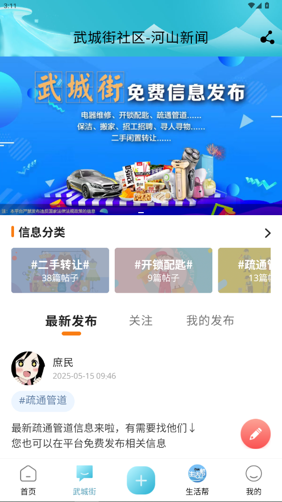 点击 “武城街” 板块,这里可以免费发布各类生活信息,包括二手转让、开锁配匙、疏通管道等信息分类。