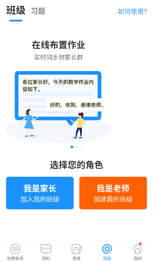 我是老师:可以创建班级,在线布置作业,内容实时同步到家长群。