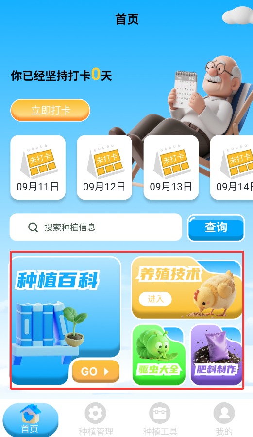2、在首页功能区,可查阅种植百科、养殖计数、驱虫指南及肥料制作教程。