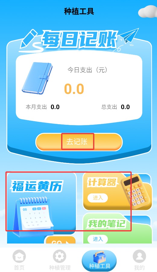 4、进入工具中心后,可使用记账、黄历查询、计算器及笔记记录等功能。