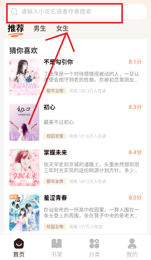 内容导航:顶部可通过 “推荐”、“男生”、“女生” 切换不同频道。