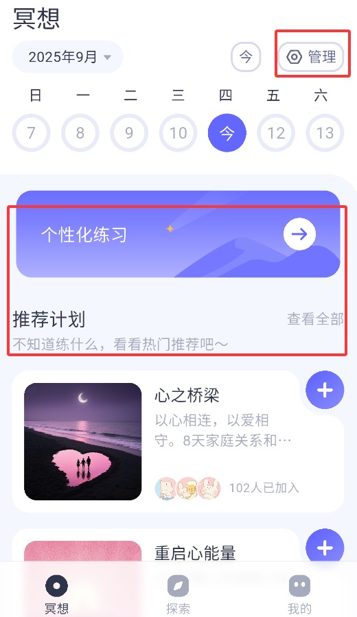 2、在冥想板块,可点击右上角管理个性化练习计划或使用推荐课程。