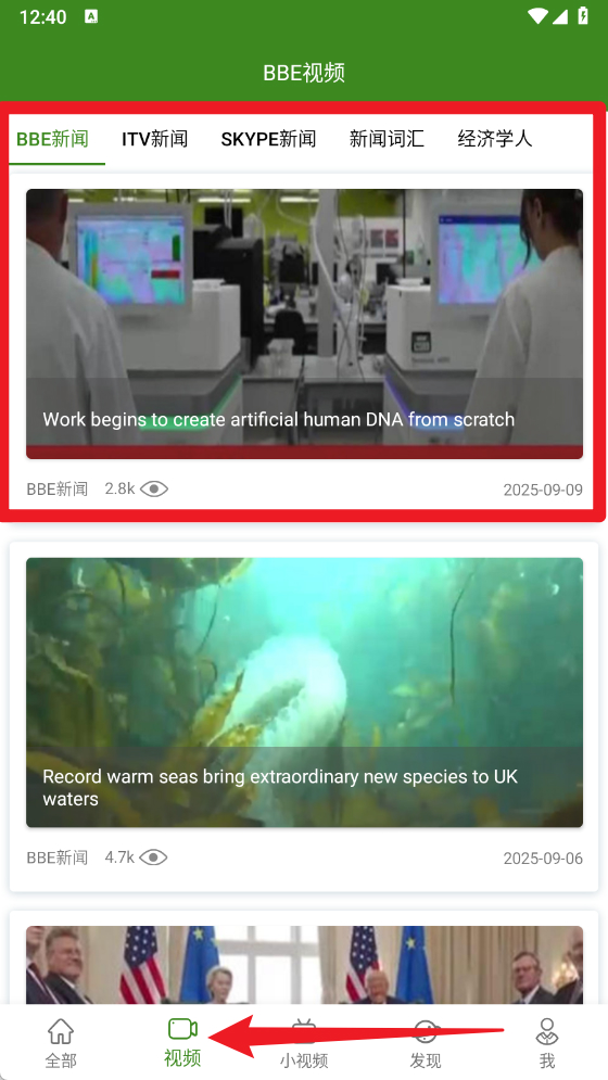 3、点击底部的视频菜单,可以进入BBE视频板块,选择不同主题的英语新闻视频进行学习。