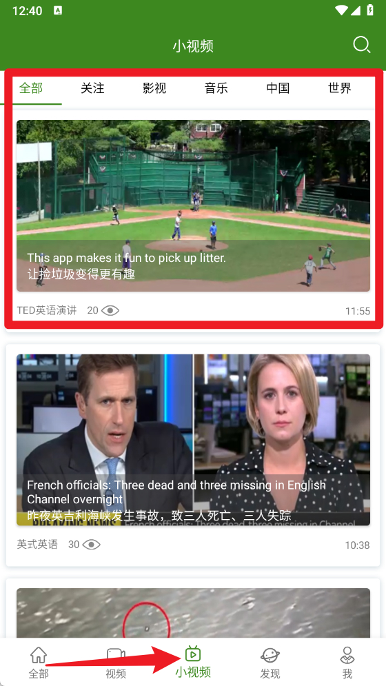 4、在小视频栏目中,可以浏览更多英语短视频,涵盖影视、音乐、新闻等多种学习场景。