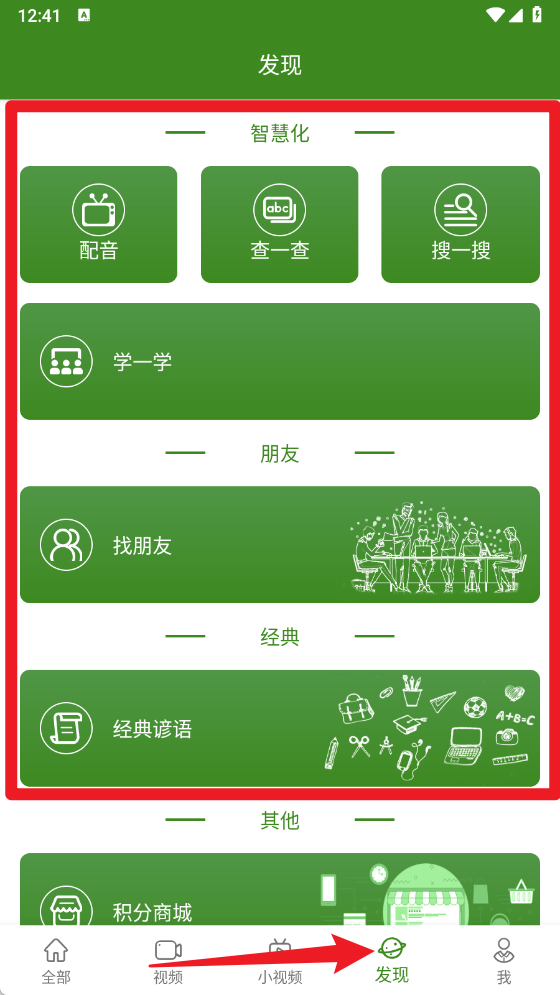 5、点击发现栏目,可以使用配音、查一查、搜一搜等智慧化学习功能,还能学习经典谚语,提升综合英语能力。