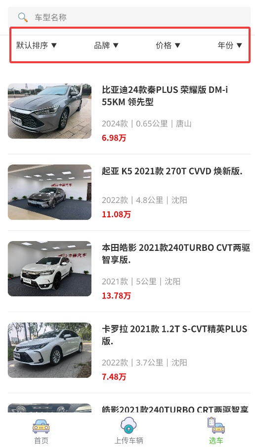 4、选车中心支持按品牌、价格、年份及默认排序等多维度条件精准筛选。