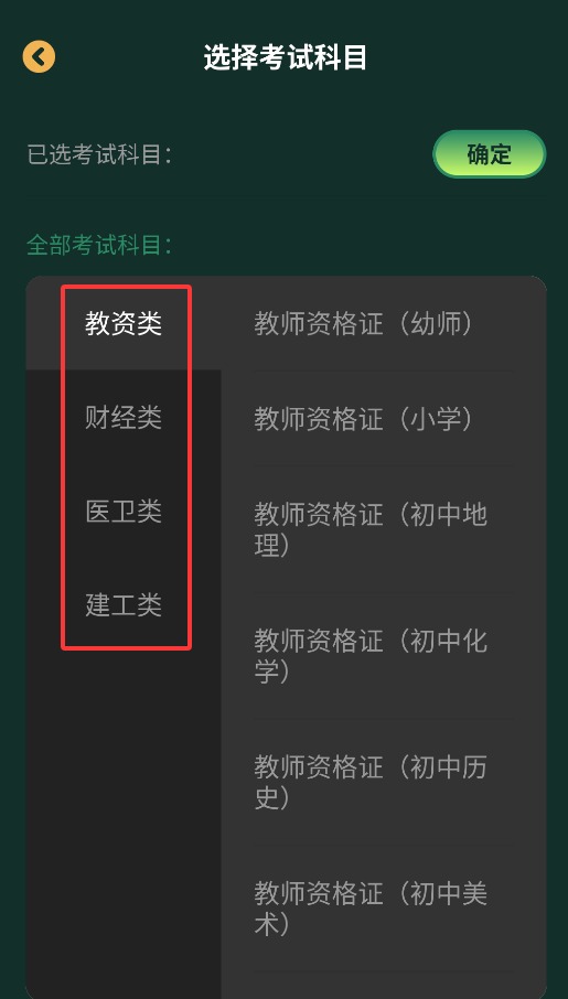 2、根据个人需求选择考试类型与科目,系统将自动匹配对应学习资源。
