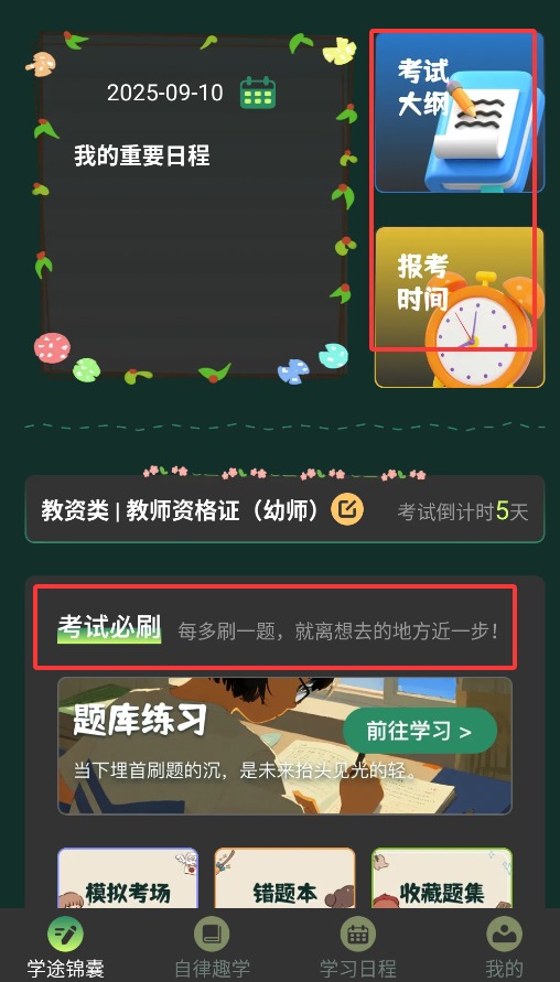 3、学途锦囊板块提供考试大纲、报考时间及必刷题库等备考核心内容。
