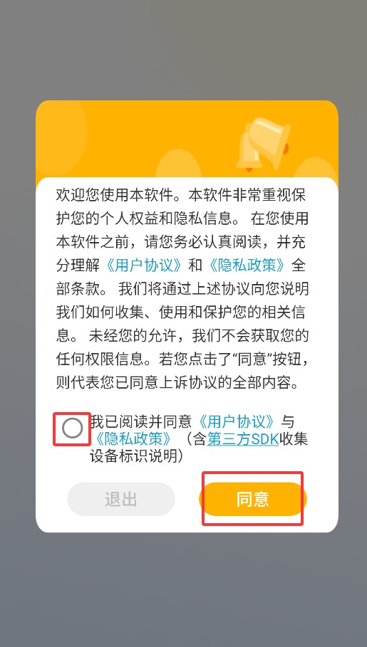 1、首次启动APP时需点击同意用户协议弹窗,方可进入主界面开始使用。