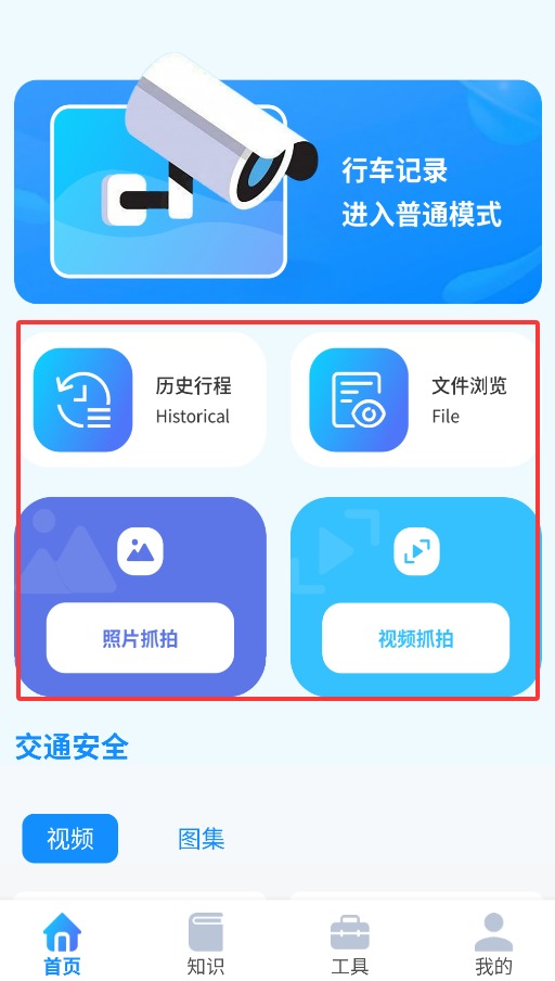 2、首页提供历史行程查询、文件管理及实时视频/照片抓拍等行车记录功能。