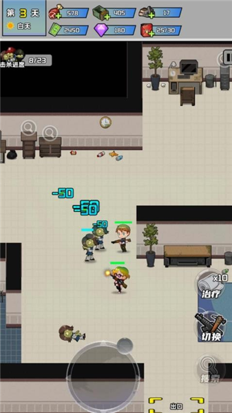 1、在游戏场景中留意第3天、白天等时间信息和资源数值,操控角色利用治疗、切换等按钮与僵尸战斗,关注击杀进度。