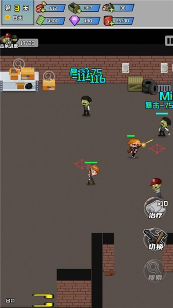 2、继续战斗过程中,注意角色攻击伤害数值(如-75)和暴击提示(如暴击-75),合理走位躲避僵尸攻击。