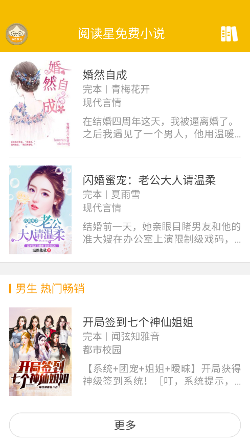 展示热门推荐书籍,如《婚然自成》、《闪婚蜜宠》等。