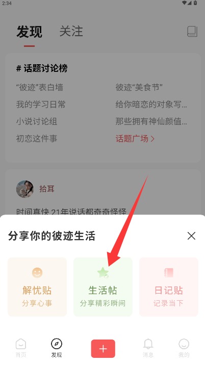 3、进入应用主页面点击发布功能,选择需要发布的帖子类型开始创作内容。