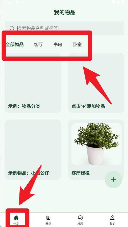 2、在物品页面,可以按照客厅、书房、卧室等场景分类查看全部物品,支持点击加号按钮快速新增物品。