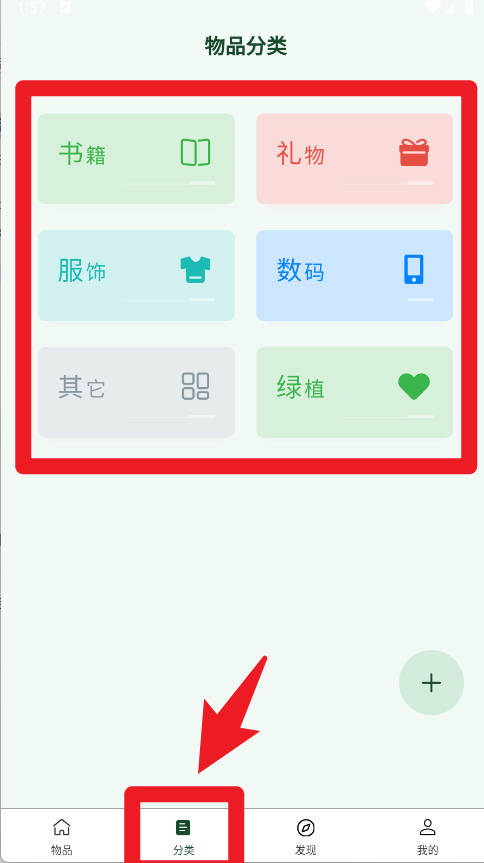 4、分类页面提供书籍、礼物、服饰、数码、绿植等常见物品类别,用户可以直观地管理不同类型的物品。