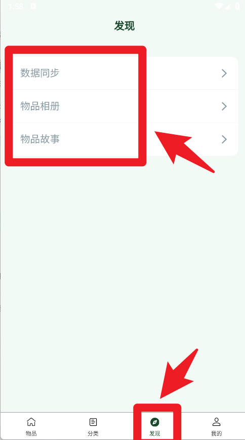 5、在发现页面中,用户可以使用数据同步、物品相册功能,实现跨设备管理,还能为物品记录点滴回忆。