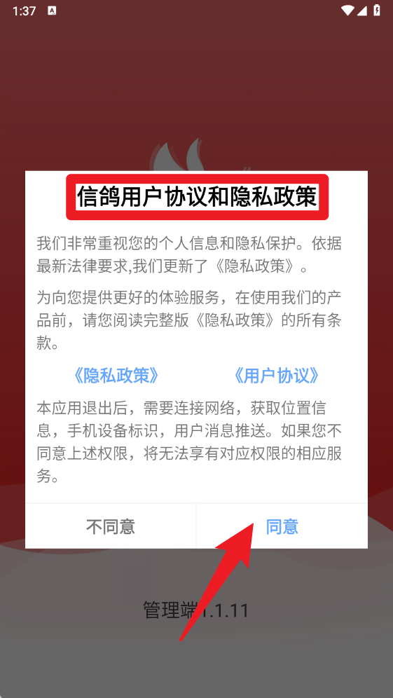 1、首次打开app,会弹出《用户协议》《隐私政策》提示,请仔细阅读并点击同意。